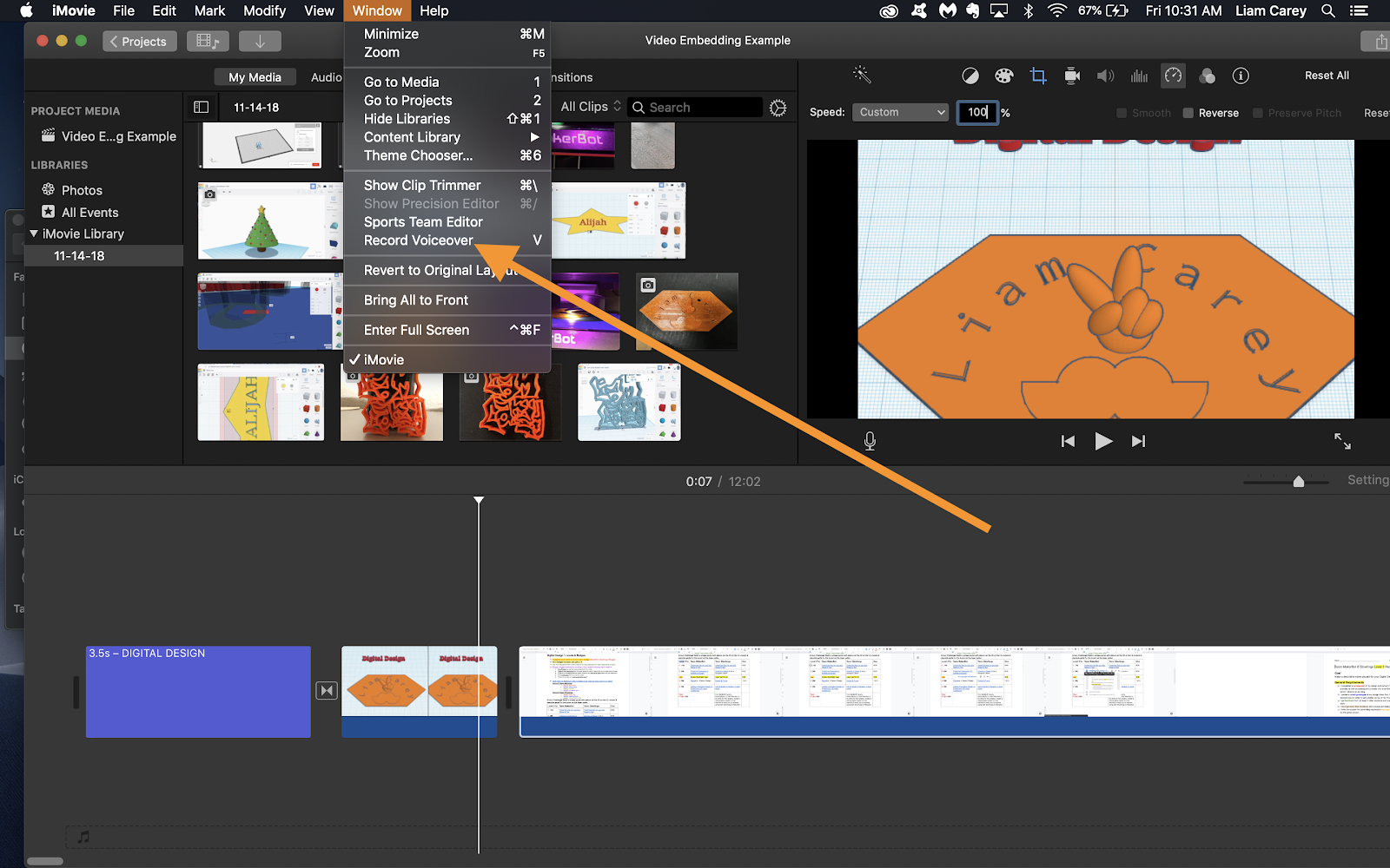 Step 11: Preview your movie & edit as needed. When the footage is set, go to the start of your movie & then record a voiceover by clicking Window → Record Voiceover.